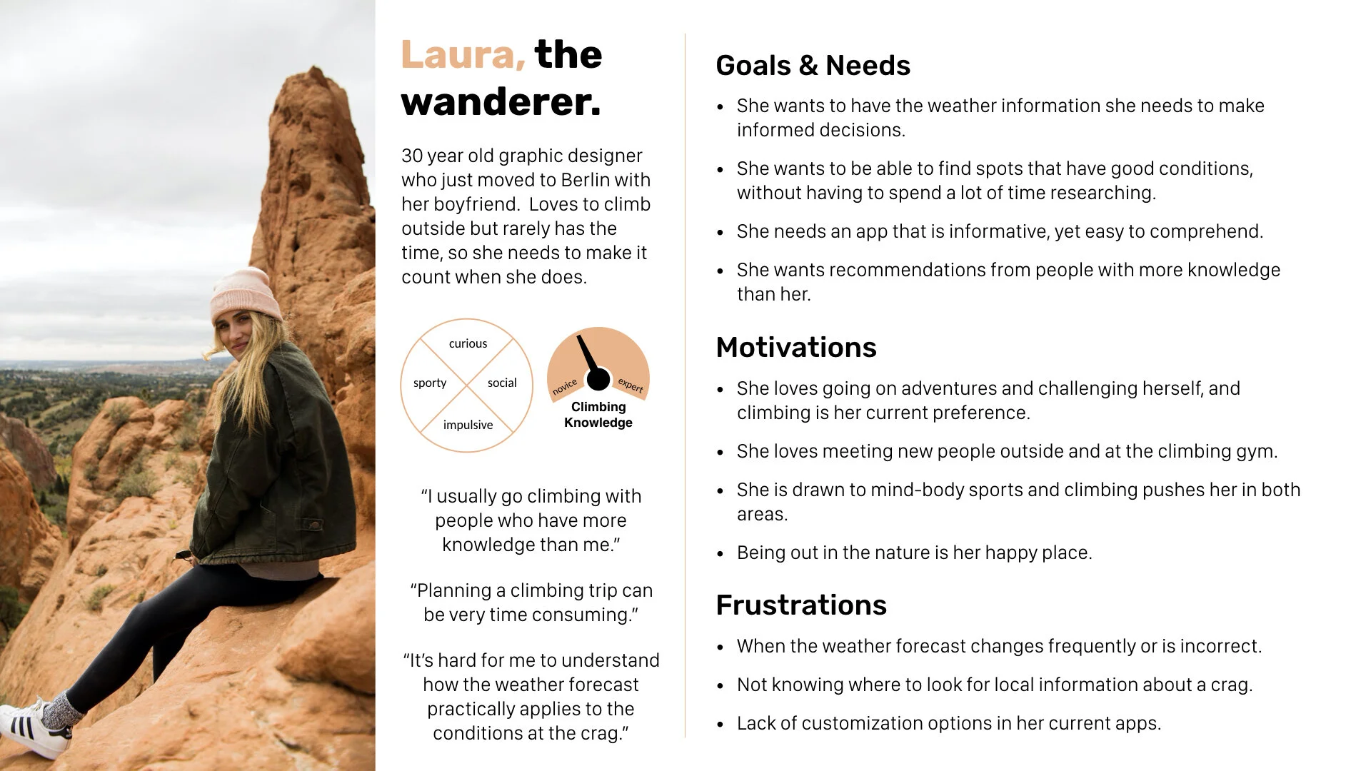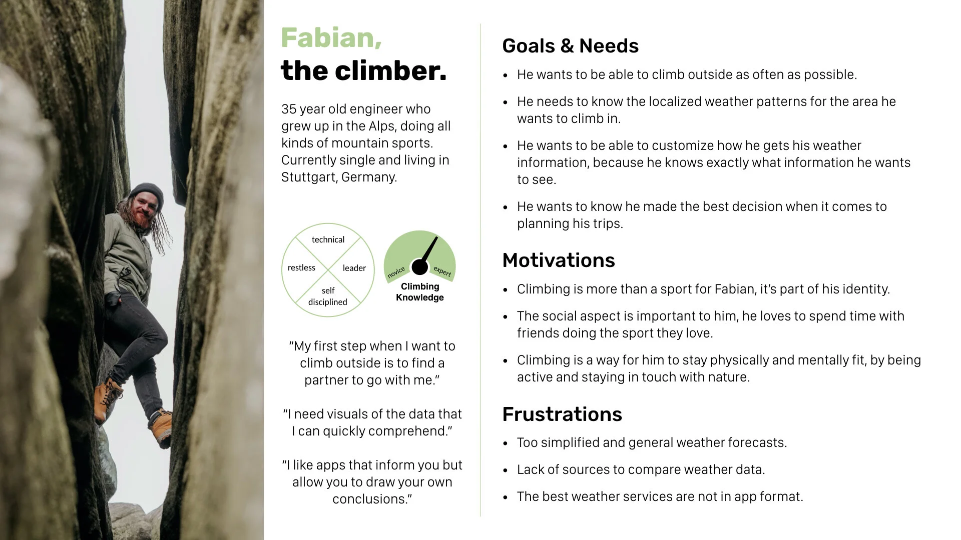 I crafted two user personas, Laura and Fabian. This allowed me to combine all of the important information about the climbers into a relatable resource which I could always refer to, to ensure the user remained central to the design process.