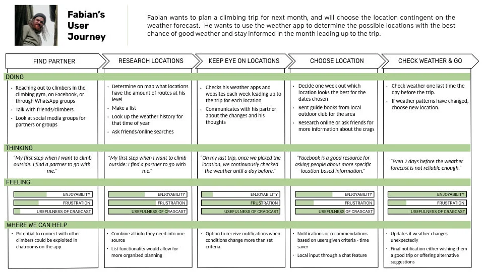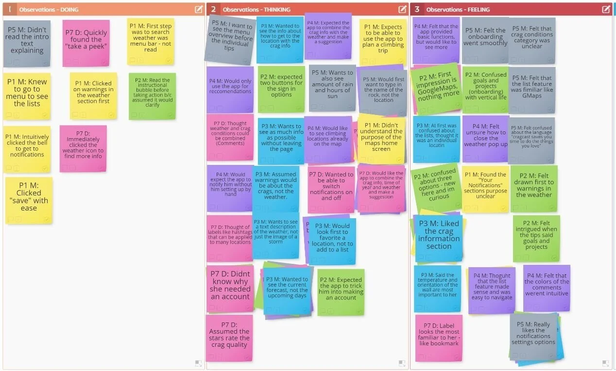 I pinpointed actionable data points by affinity mapping, which enabled me to separate important details, group similarities, and visually decipher what each person was doing, thinking and feeling when planning climbing outings.