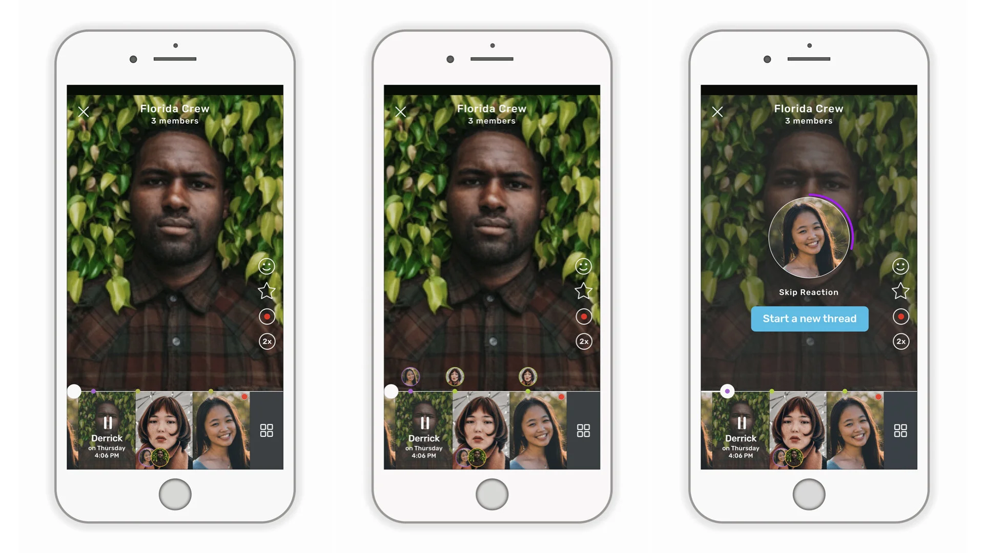 Currently, when you play a reaction, it plays as a stand alone video, with no context and no reference to the timeline. In addition, if you want to directly respond to a reaction, it only allows you to do so in a private message to that person, removing you from groups or the current chat.