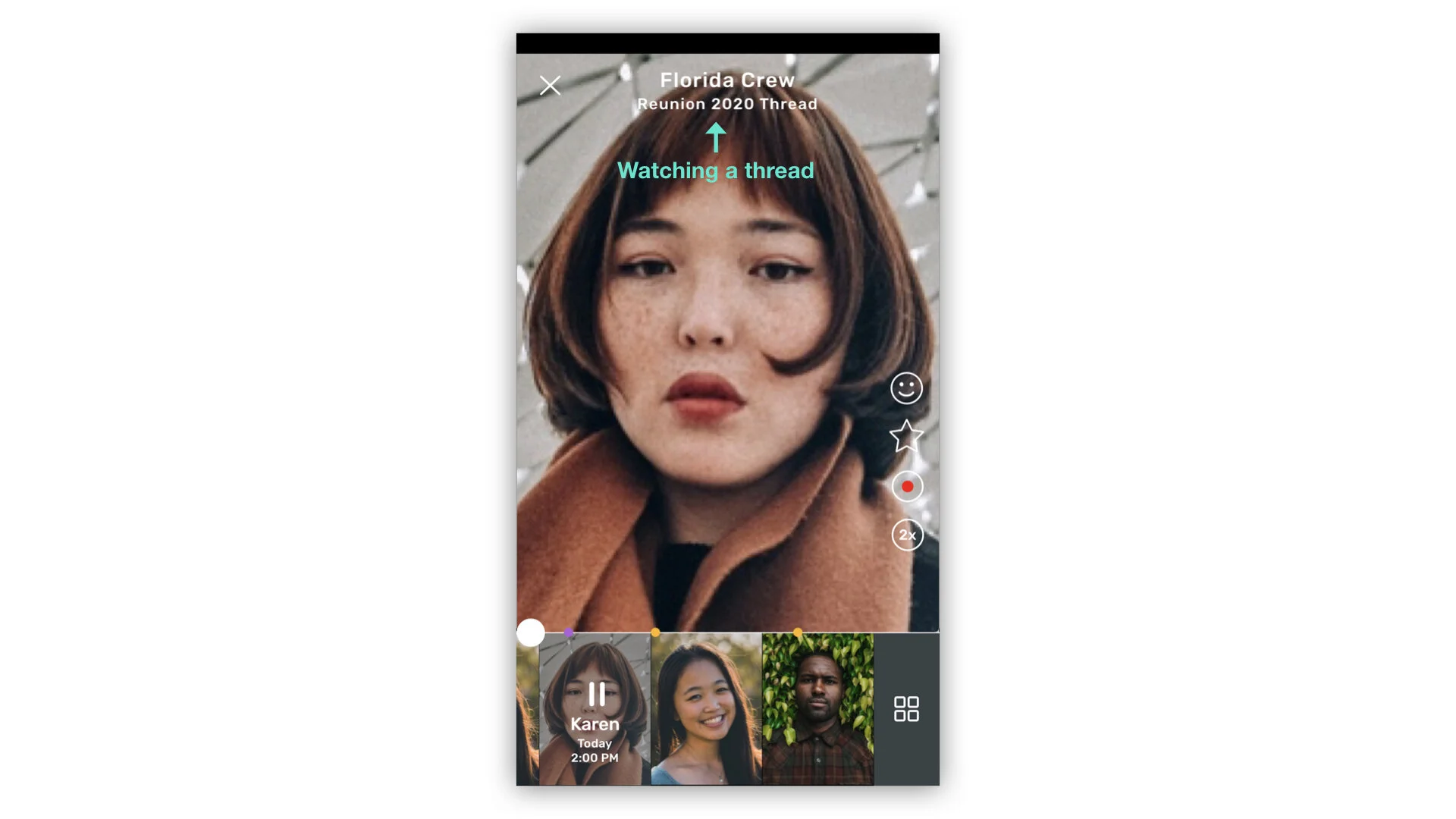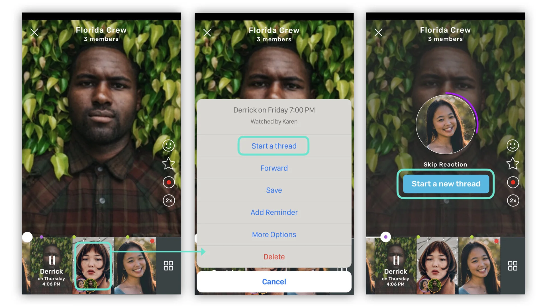 Users could start a thread by either pressing on a video tile to open the video menu, and then pressing "start a thread" (2nd photo). Alternately, they could start one directly from a reaction (3rd photo).