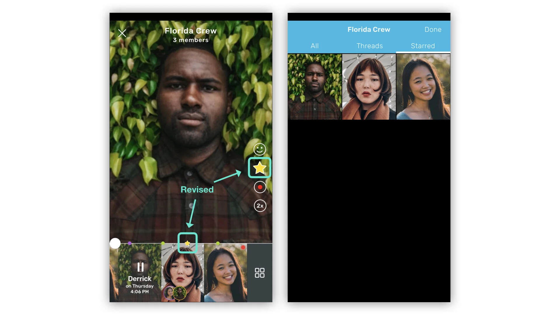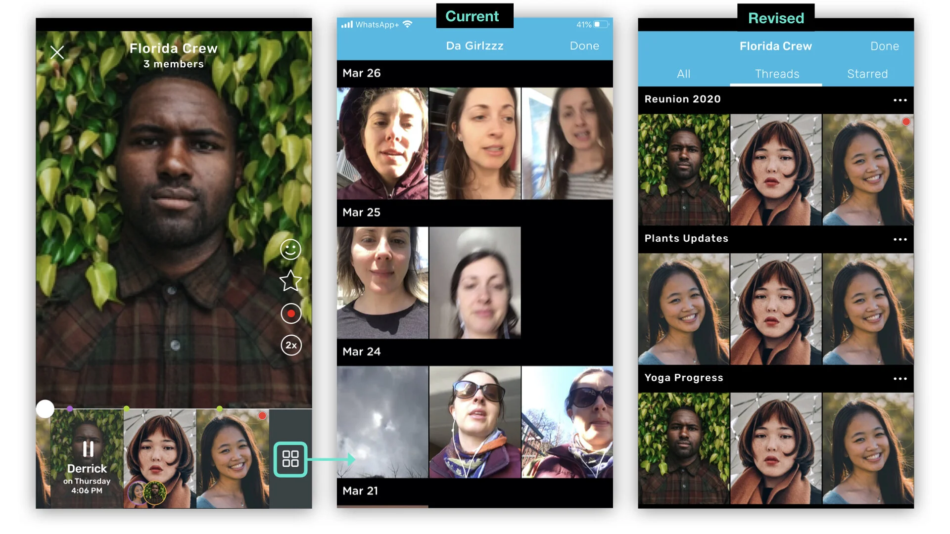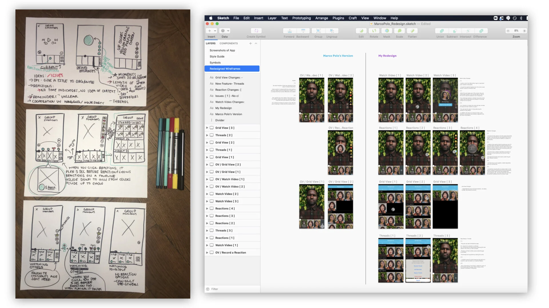 I got to work by redesigning what I consider to be 3 essential user experiences in the app: video reactions, organizing the conversation, and favorite moments (each explained in more detail below). I got out my pen and paper to sketch out some initial wireframes, and then opened up Sketch to digitalize them.
