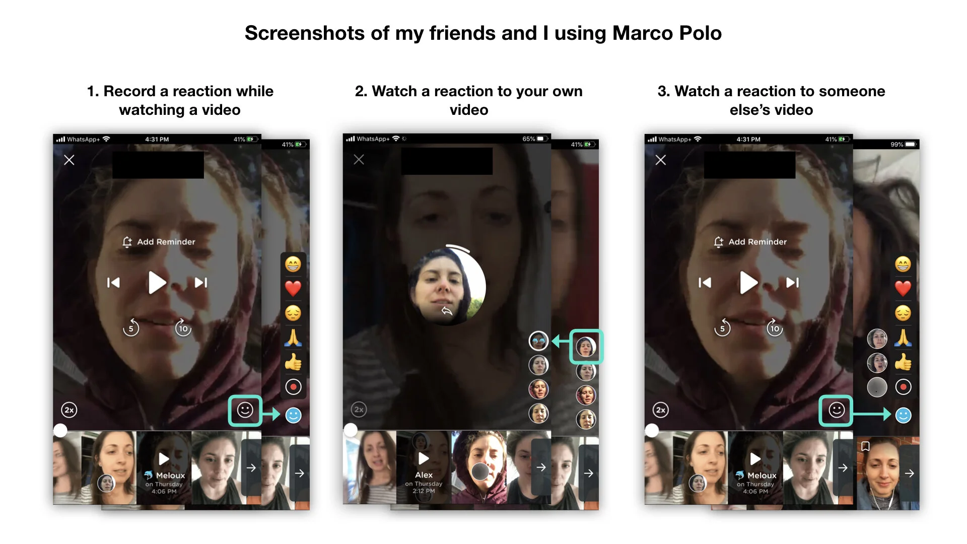 I propose to move the reaction bubbles onto the timeline. By using the variety of colors from Marco Polo's logo, each user can have their own color in the chat. The reactions are marked by a colored dot on the timeline, which can be expanded by swiping up on the screen to reveal the face bubbles of each reaction.